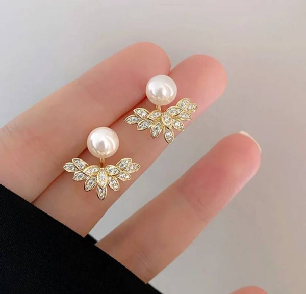 410 Aretes perla y hojas diamantadas